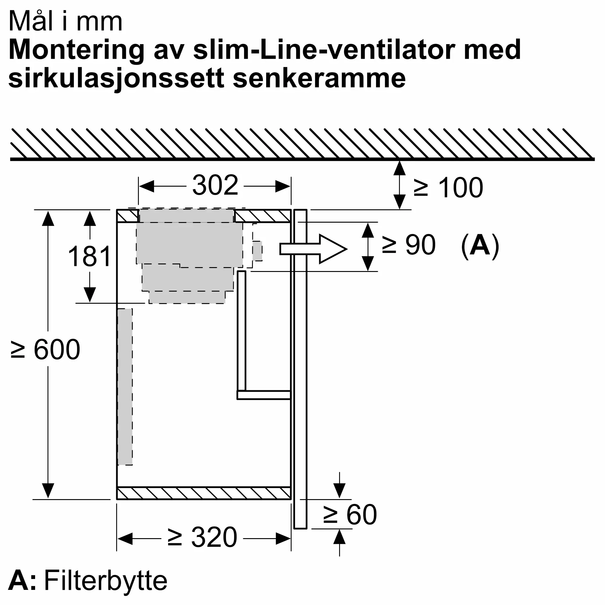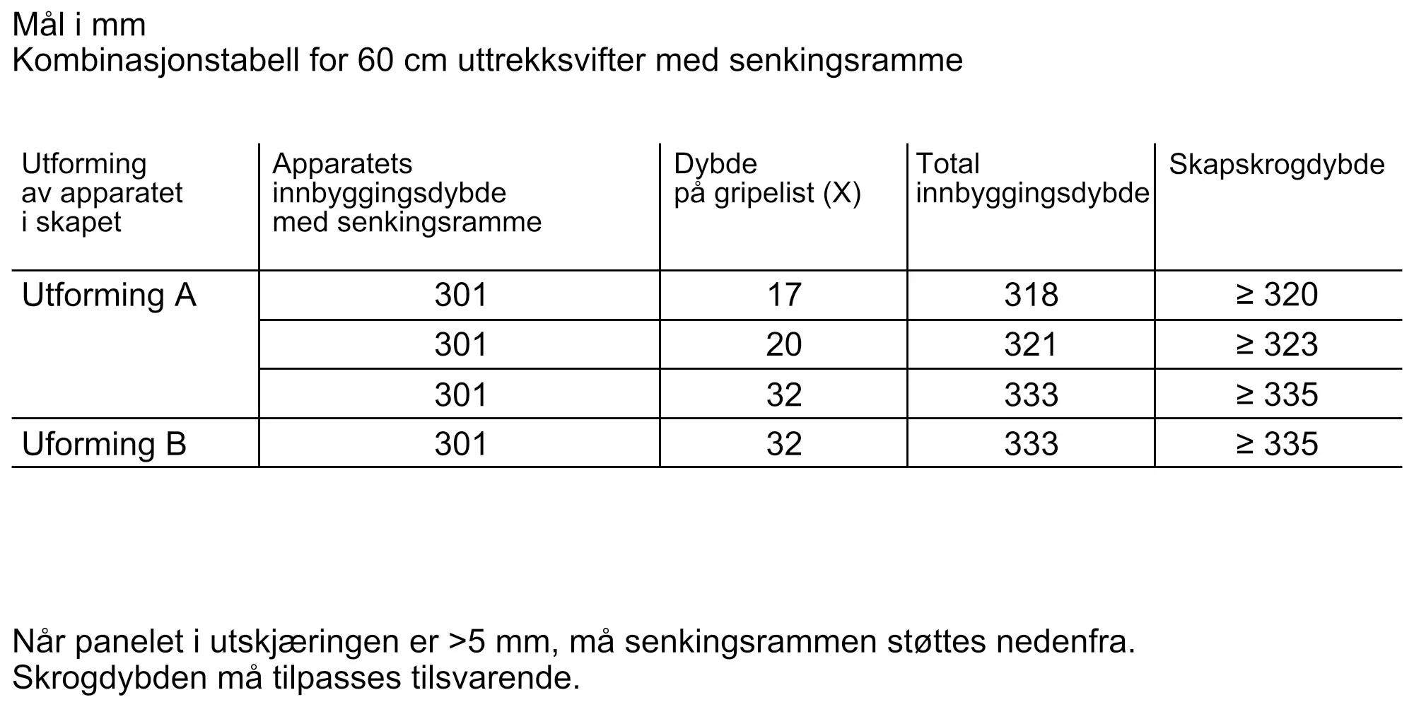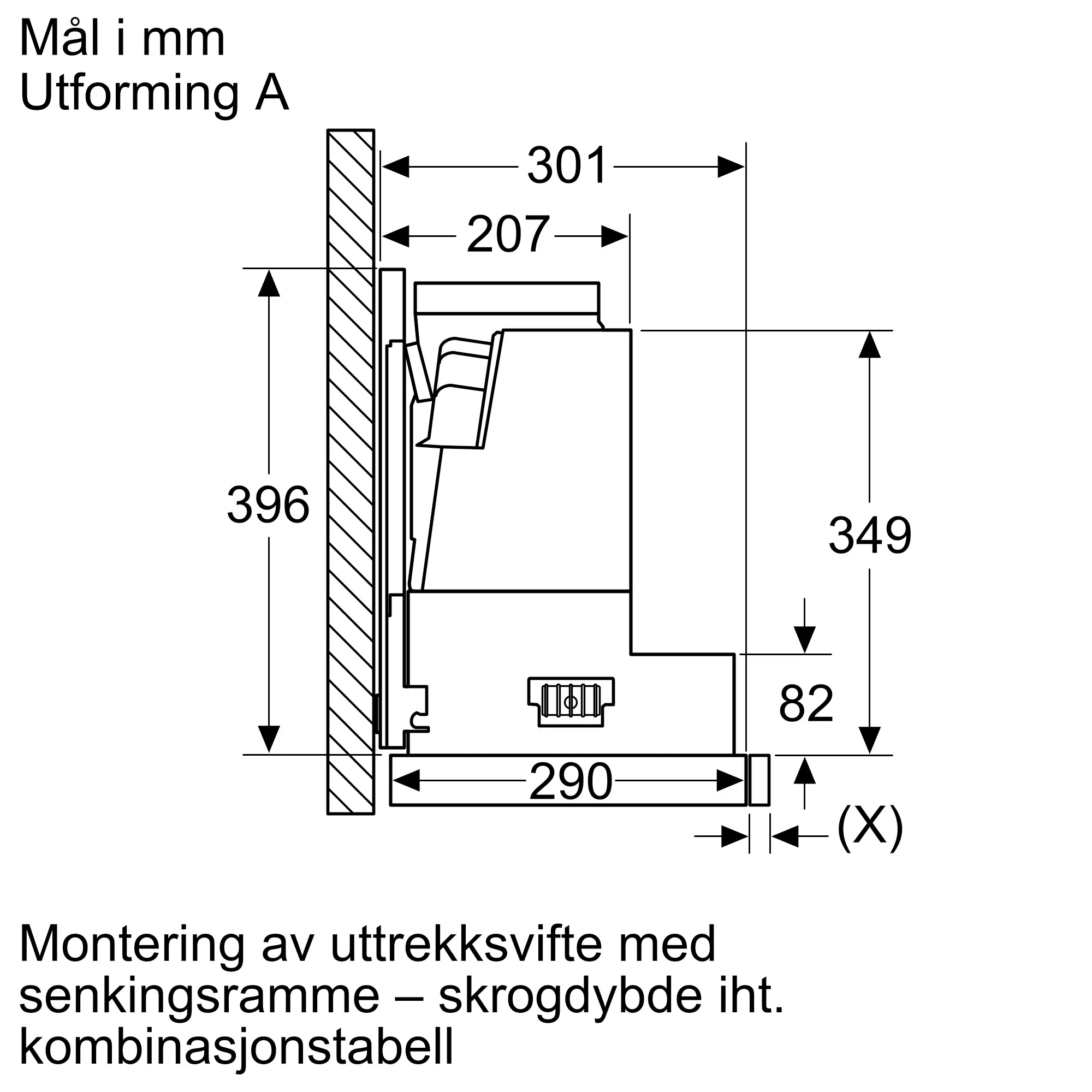 Nedsenkingsramme lar den uttrekkbare ventilatoren forsvinne helt i overskapet.
