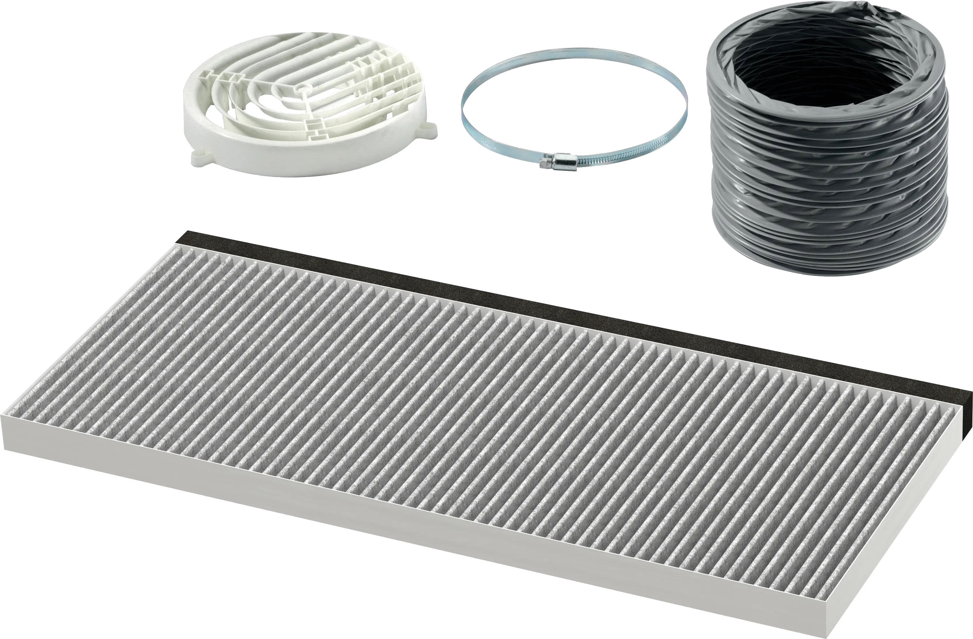 Bestående av Clean Air Standard aktivt kullfilter, diffusor, fleksibel slange ø 150 mm, 800 mm lang med slangeklemme og monteringsmateriale