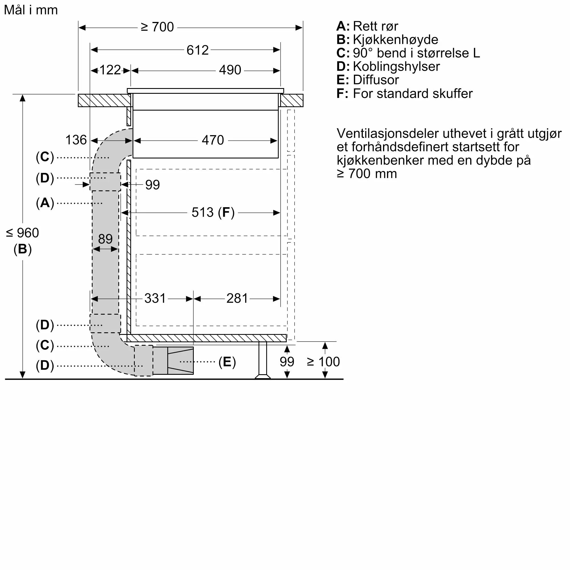 Tilbehørssett for delvis kanalisert resirkuleringskonfigurasjoner av platetoppen med integrert ventilasjon i kjøkken med benkeplatedybder på 70 cm eller større.