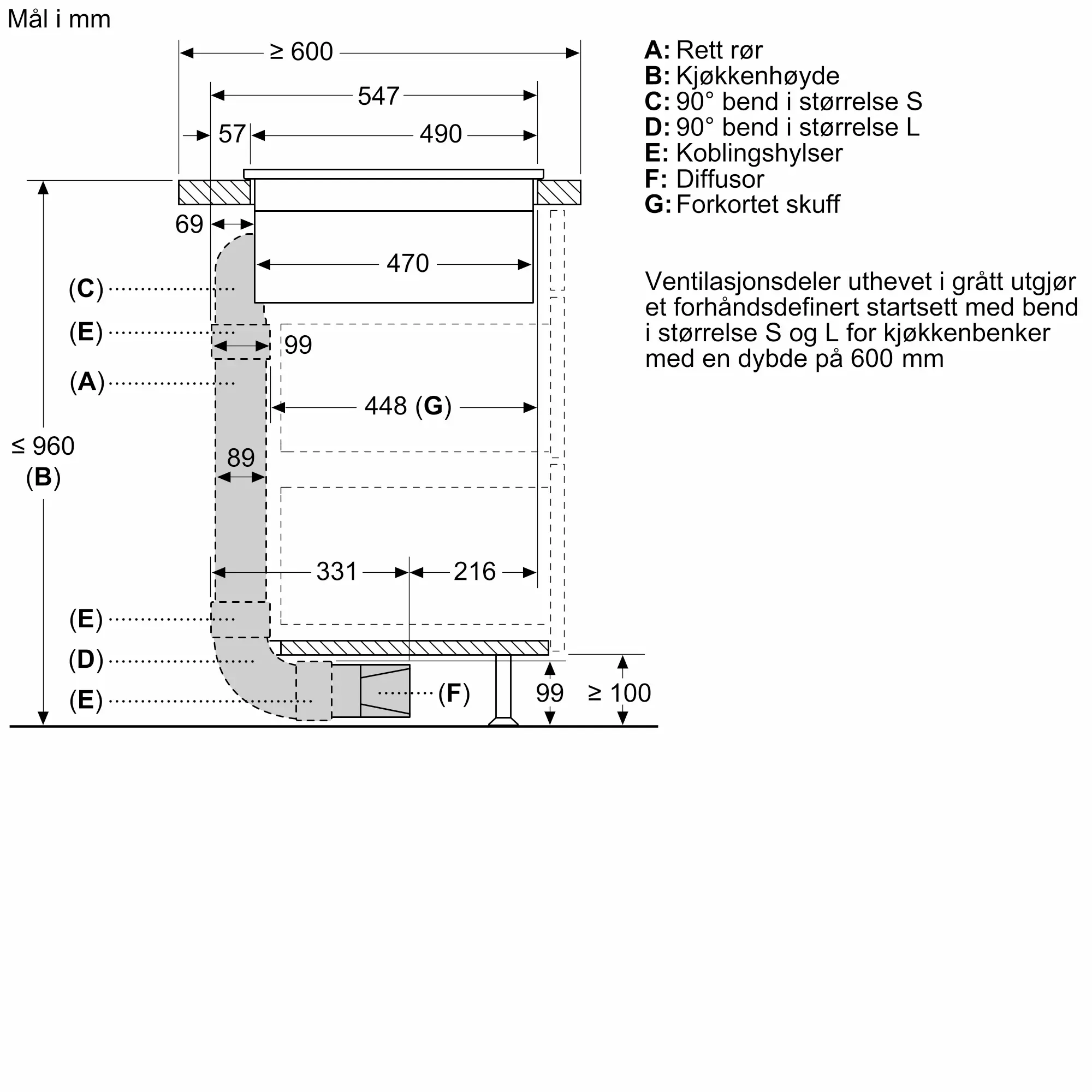 Tilbehørssett for delvis kanalisert omluftsdrift av platetoppen med integrert ventilasjonsmodul for kjøkken med benkeplatedybde på 60 cm (eller større).