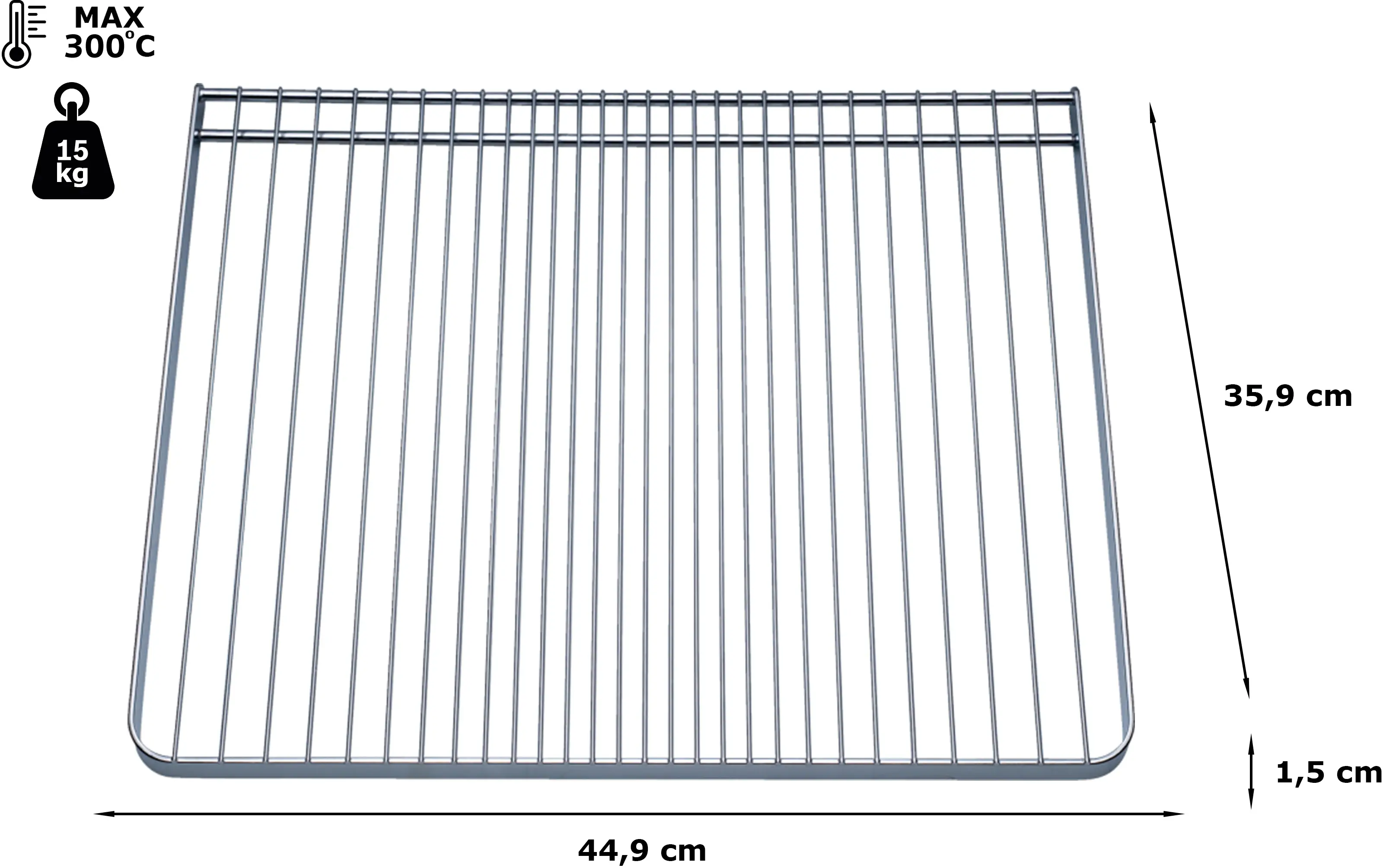 Målene på kombiristen er 44,9 x 35,9 x 1,3 cm
