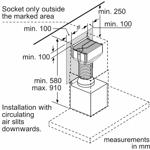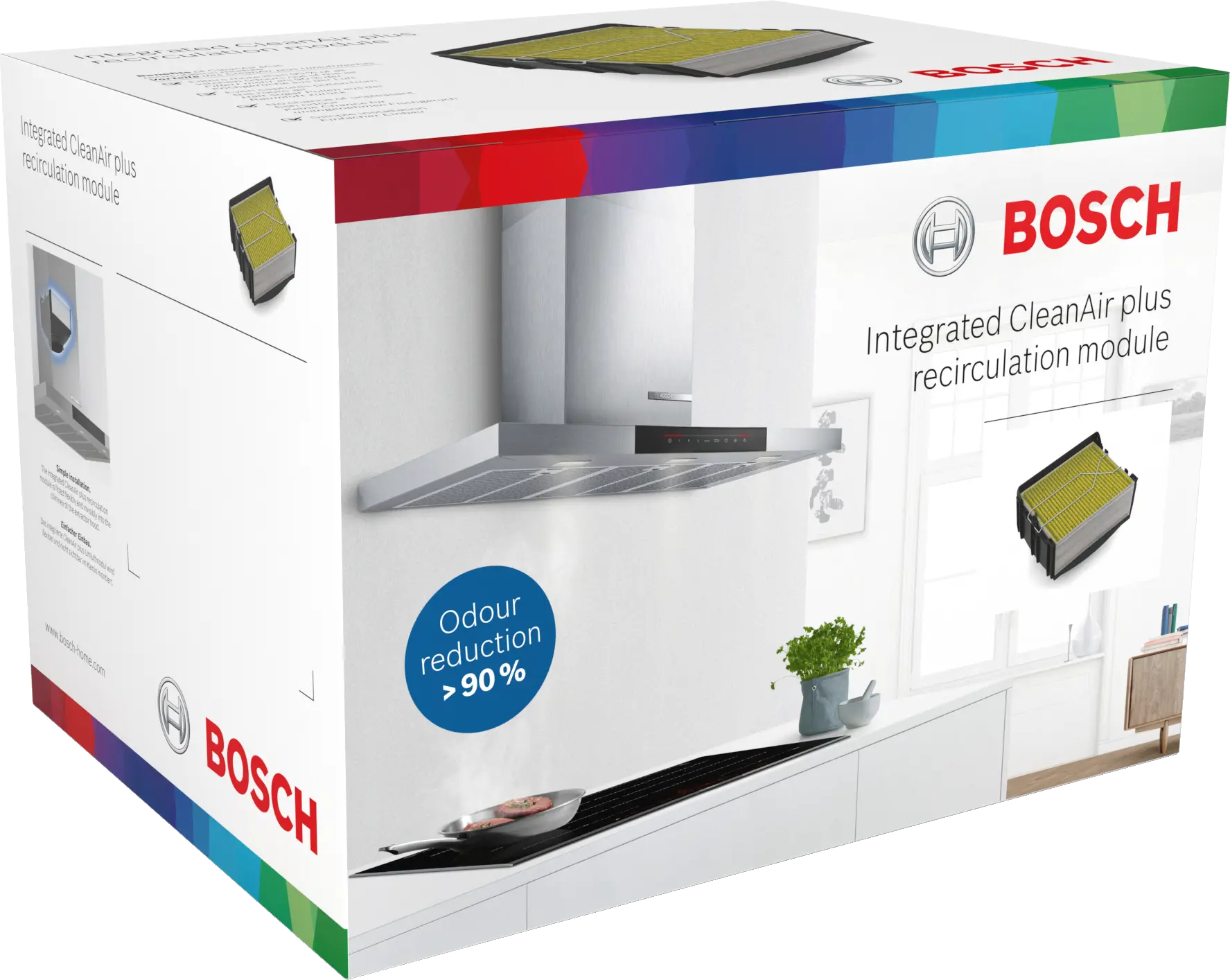 Integrert design: Integrert Clean Air Plus resirkuleringssystem er montert usynlig inne i skorsteinen. Installasjon er mulig på ulike høyder.