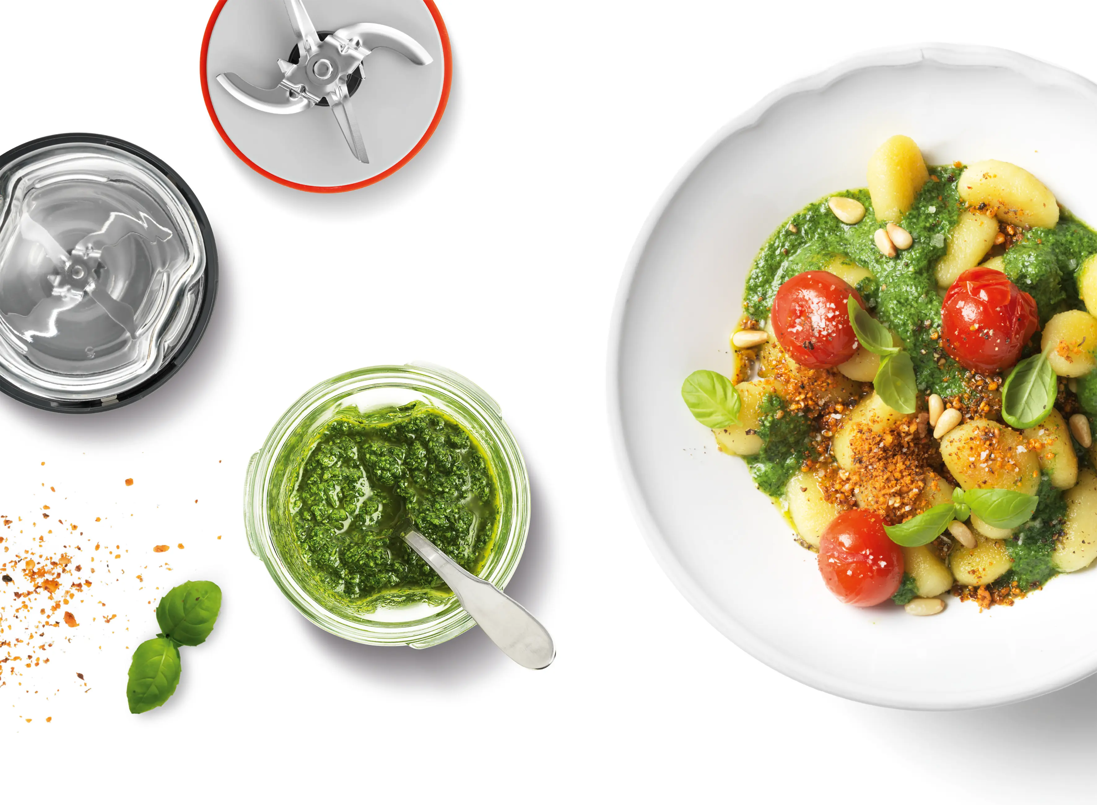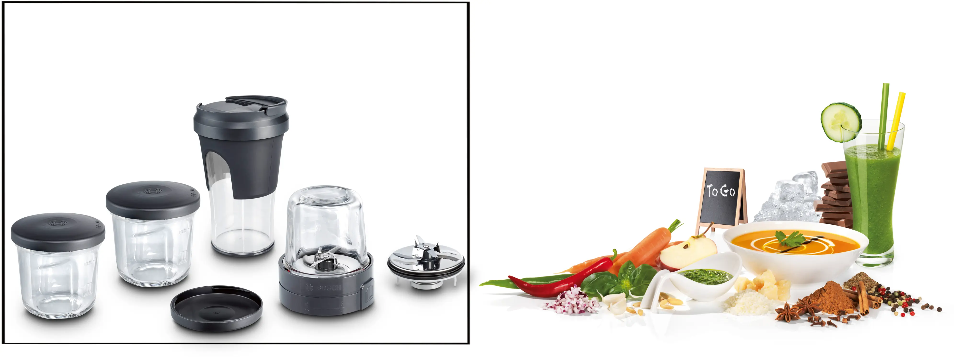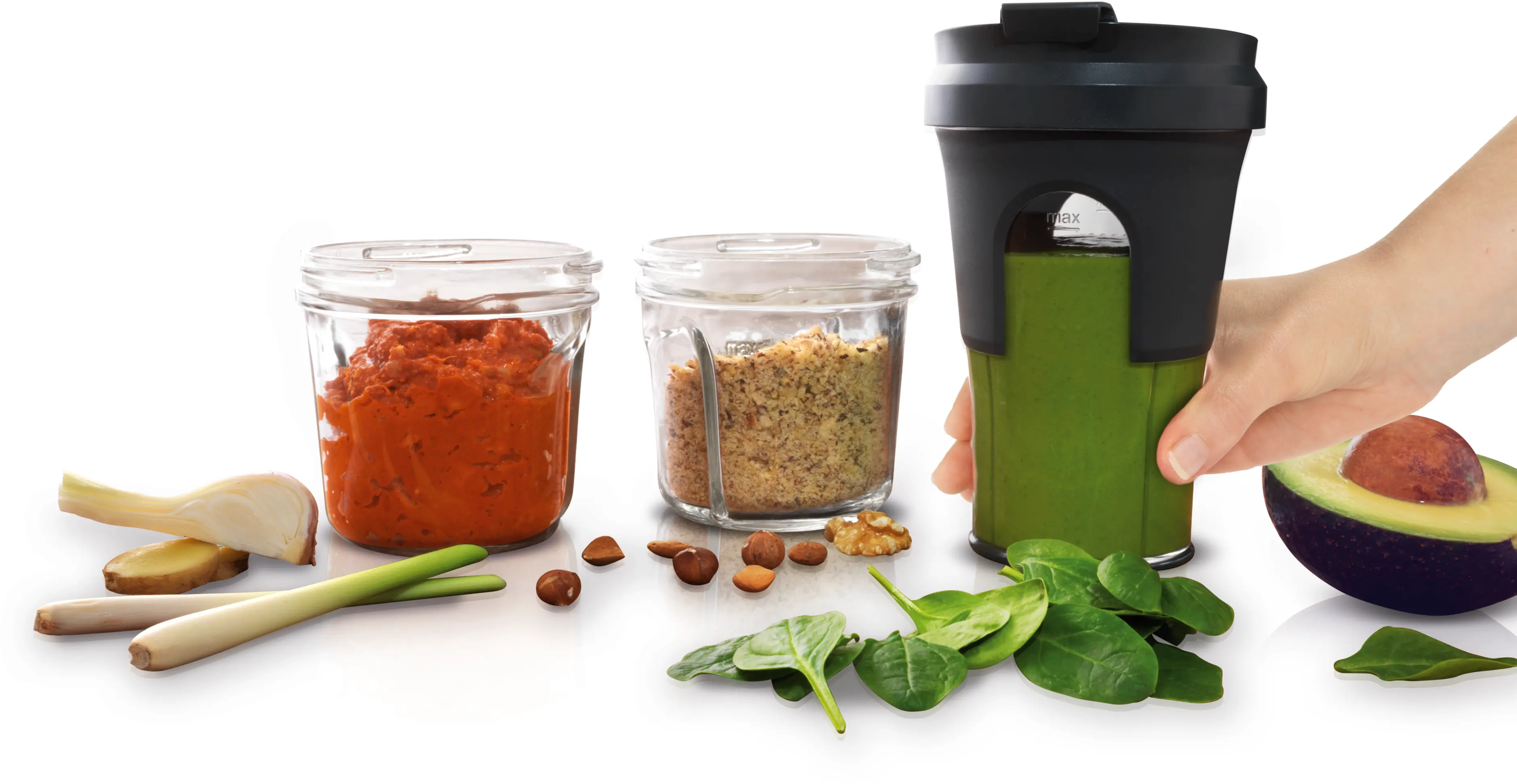 Kompakt og allsidig tilbehørssett med gjennomtenkt 5-i-1 funksjonalitet: kvern for urter/krydder, hakker og blender samt praktisk oppbevaring og ToGo-funksjon.