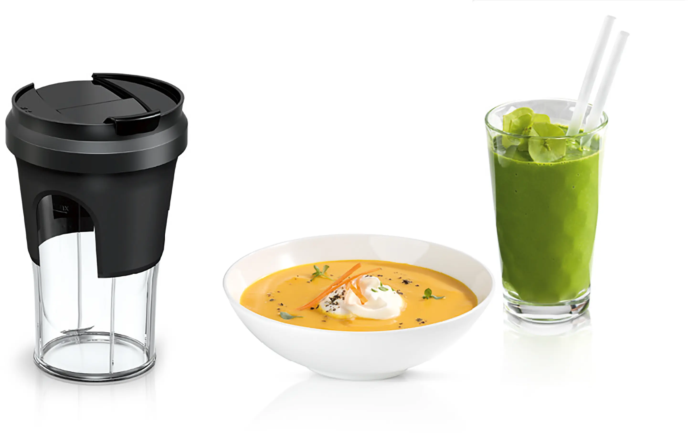Praktisk bruk av mikserbegere for å blande supper og mikse drikker. Praktisk ToGo-beholder.