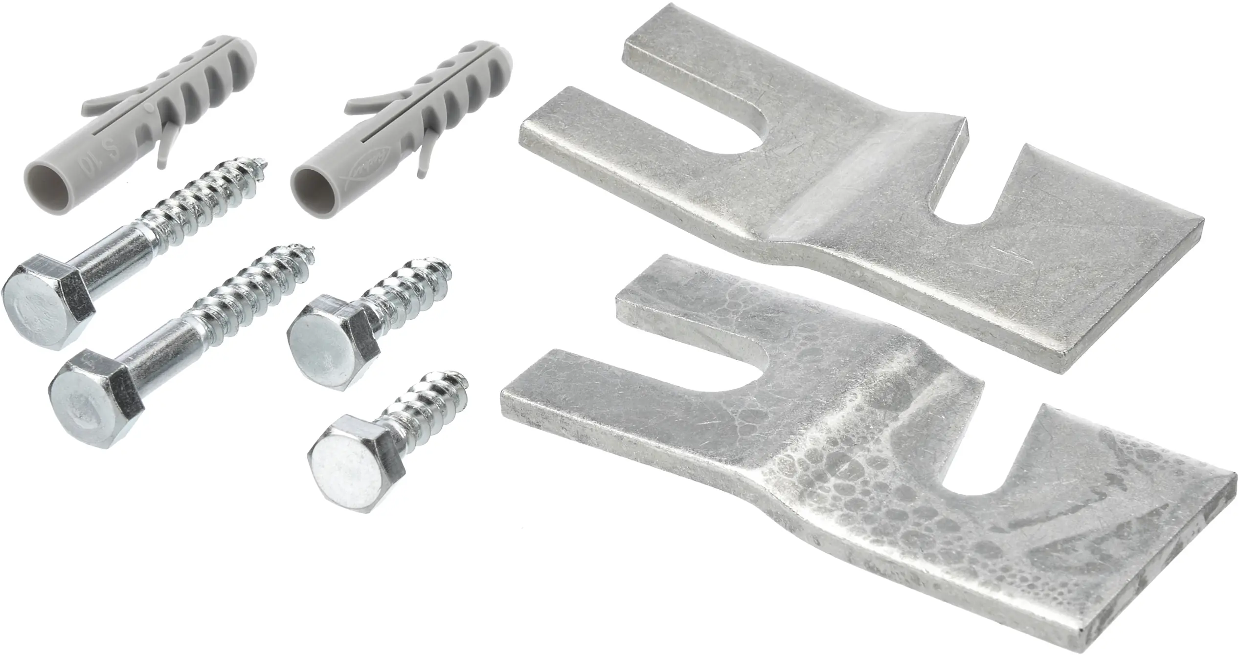 Settet består av to metallfesteplater, heksagonskruer og veggbolter